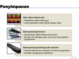 Laci serbaguna di belakang sofa. Asingkan Akaun Simpanan dan Belanja. Keselamatan barang-barang stor dan memastikan cara penyimpanan yang sesuai terlindung dari iklim dan suhu kelembapan 34 PENYIMPANAN YANG SESUAI UBAT-UBATAN KERTAS BAHAN-BAHAN KIMIA DISUSUN DENGAN TERATUR TEMPAT YANG TERKAWAL DAN BERKUNCI SUHU IKLIM DAN KELEMBAPAN YANG BERSESUAIAN.